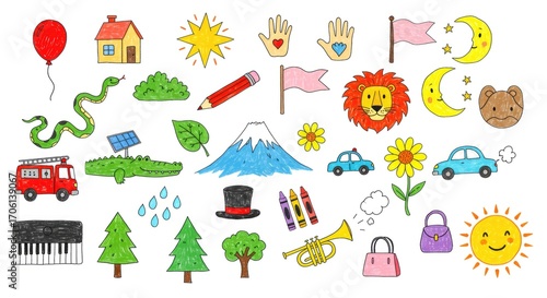A vibrant and whimsical collection of hand drawn illustrations featuring a variety of playful objects and characters perfect for children s themes and educational materials