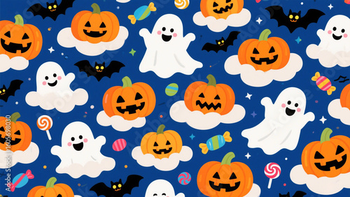 A vibrant and whimsical Halloween-themed pattern featuring cheerful white ghosts with smiling faces, floating on fluffy clouds. Halloween, Halloween Costumes, Halloween Background, Happy Halloween