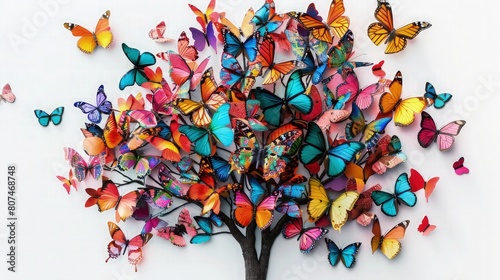 A vibrant and whimsical tree made with colorful butterflies isolated on white background