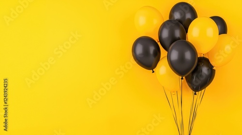 A vibrant arrangement of black and yellow balloons against a cheerful yellow background, perfect for celebration and decoration.