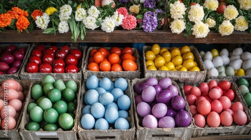 A vibrant arrangement of colorful eggs surrounded by fresh flowers, celebrating the spirit of Easter.