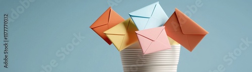 A vibrant arrangement of colorful envelopes perched in a cup, symbolizing communication and creativity against a soft blue background.