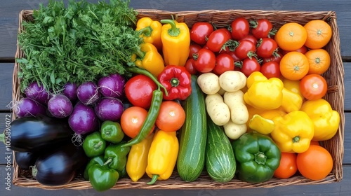 A vibrant arrangement of fresh vegetables including peppers, tomatoes, and herbs in a wicker basket, showcasing nature's bounty.