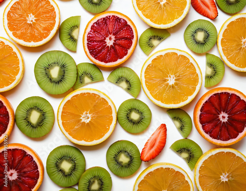 A vibrant arrangement of freshly cut fruit slices, including orange, lemon, kiwi, and strawberry, placed in a geometric grid pattern on a seamless white background, showcasing bright, juicy textures.