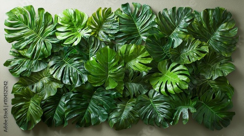 A vibrant arrangement of green tropical leaves creating a lush, decorative wall feature.