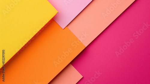 A vibrant arrangement of overlapping colored paper sheets in yellow, pink, orange, and magenta