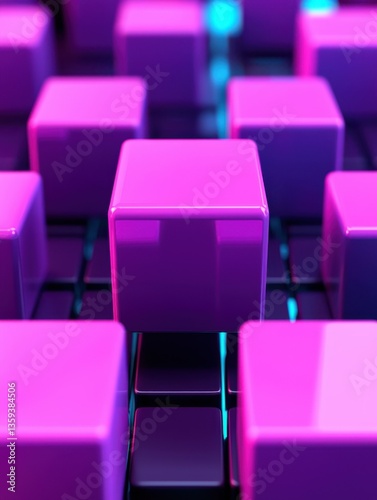 A vibrant arrangement of purple cubes against a dark background, featuring glowing accents that create a modern, digital aesthetic.
