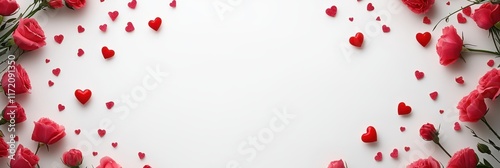 A vibrant arrangement of red roses and scattered hearts, creating a romantic atmosphere perfect for Valentine's Day celebrations.
