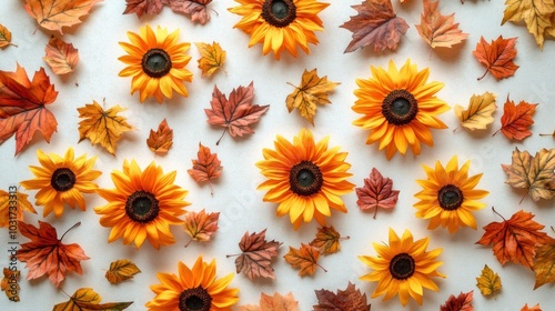 A vibrant arrangement of sunflowers and autumn leaves on a light background.