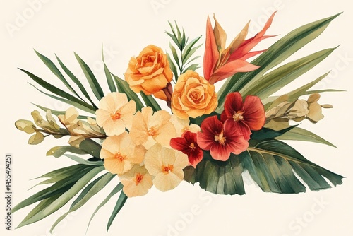 A vibrant arrangement of tropical flowers and foliage.