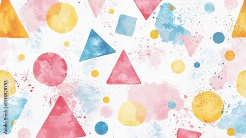A vibrant arrangement of various geometric shapes in shades of red, blue, yellow, and pink is set against a white background, offering a lively and artistic design suitable for various creative uses
