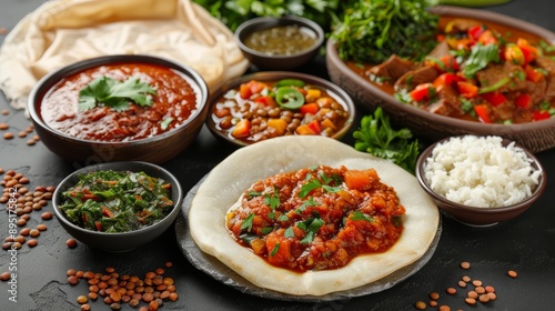 A vibrant array of Indian dishes, featuring flavorful curries, rice, and fresh herbs on a rustic table.