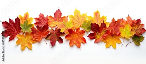 A vibrant array of maple leaves is scattered on a pure white background visible from both the front and back with a neat cut out shape surrounding them. Creative banner. Copyspace image