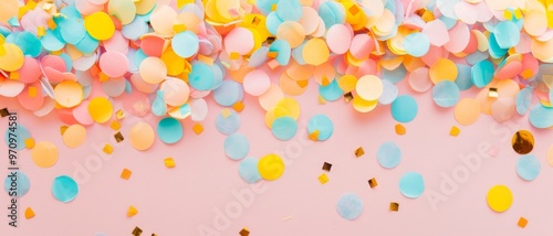 A vibrant array of multicolored confetti scattered across a pink background, evoking a festive and celebratory mood.