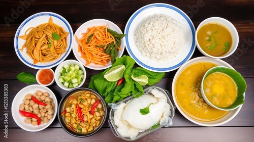 A vibrant array of Thai food selections and mixes, including pad thai, green curry, tom yum soup, and mango sticky rice, Thai, assorted, dishes