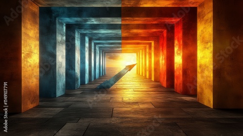 A vibrant arrow breaking through a wall of uniform arrows, symbolizing innovation and the business strategies that enable a company to stand out and achieve success.