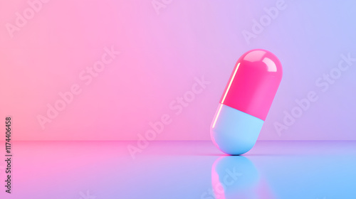 A vibrant, artistic depiction of a pink and blue capsule resting on a smooth surface, illuminated by soft, colorful lighting
