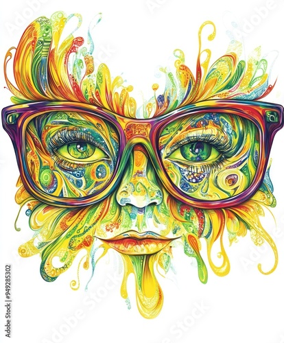 A vibrant, artistic portrait featuring colorful swirls and glasses, blending human and abstract elements.