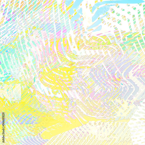 A vibrant artwork features wavy. a mix of abstract forms in colorful .