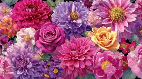 A vibrant assortment of blooming flowers in pink, purple, yellow, and white hues, densely packed together against a dark background