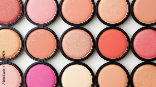 A vibrant assortment of blush compacts in various shades, neatly arranged, showcasing a range of soft to bold hues for cosmetic use.