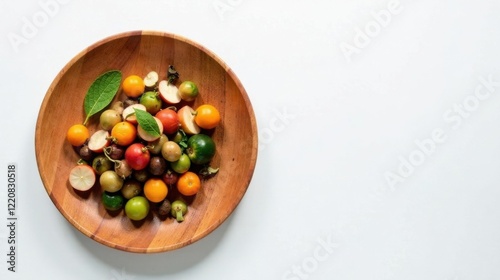 A vibrant assortment of colorful fruits artfully arranged in a rustic wooden bowl, a delightful composition for culinary or health-conscious themes.