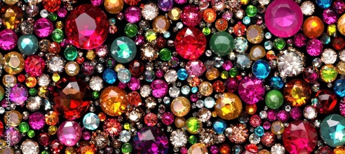 A vibrant assortment of colorful gems and rhinestones, showcasing various shapes and sizes, creating a dazzling visual effect.