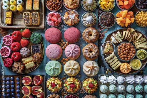 A vibrant assortment of desserts and fruits arranged beautifully on plates, showcasing a variety of colors and textures.