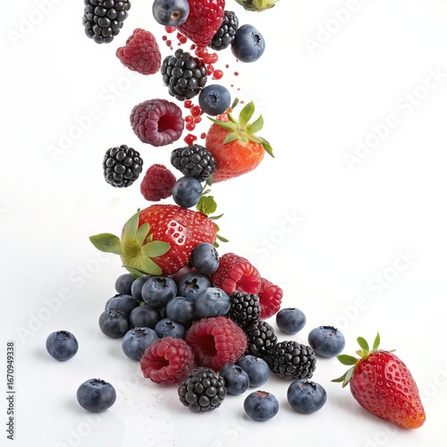A vibrant assortment of fresh berries falling and scattered on a bright white surface