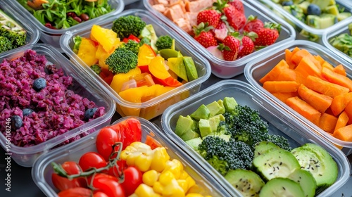 A vibrant assortment of fresh fruits and vegetables in meal prep containers, perfect for healthy eating and nutrition planning.