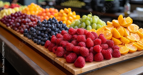 A vibrant assortment of fresh fruits, artistically arranged, showcasing a rainbow of colors and textures, symbolizing health, freshness, and appetizing diversity.