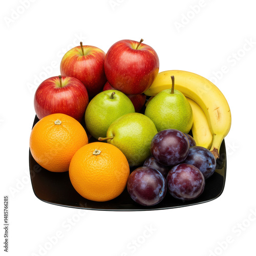 A vibrant assortment of fresh fruits including apples, pears, oranges, bananas, and plums on a black background