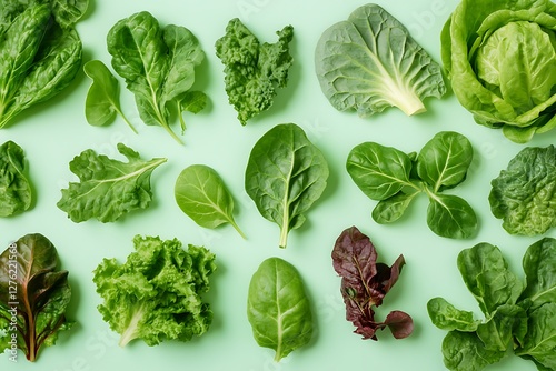 A vibrant assortment of fresh green lettuce varieties on a light green background