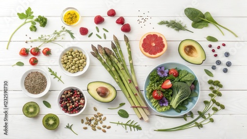 A vibrant assortment of fresh produce, including vibrant greens, colorful berries, and various vegetables, arranged artfully on a white wooden surface.