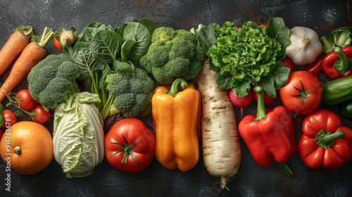 A vibrant assortment of fresh vegetables arranged neatly on a textured surface in bright natural light