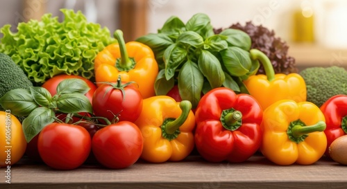 A vibrant assortment of fresh vegetables, including bell peppers, tomatoes, and broccoli, arranged artfully