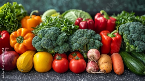 A vibrant assortment of fresh vegetables including broccoli, bell peppers, tomatoes, and carrots beautifully arranged on a black surface.