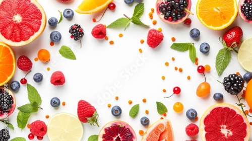 A vibrant assortment of fruits and berries arranged around a white background, featuring citrus slices, raspberries, blueberries, and mint leaves. Ideal for food-related designs and healthy lifestyle
