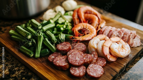A vibrant assortment of seafood and vegetables arranged on a wooden cutting board.