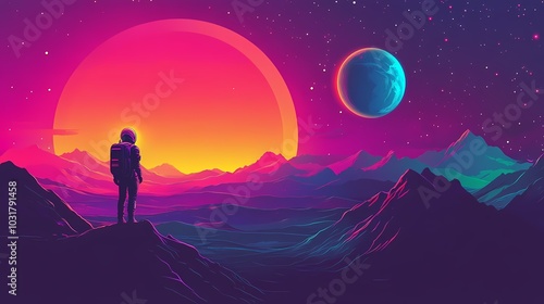 A vibrant astronaut silhouette against a colorful cosmic landscape.