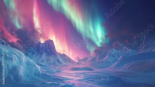A vibrant aurora borealis illuminates a snow covered mountain range.
