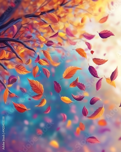 A vibrant autumn scene with colorful leaves falling from a tree. The background features a soft gradient of warm colors, evoking a serene and peaceful atmosphere.