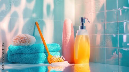 A vibrant bathroom scene with towels, a cleaning brush, and liquid soap.