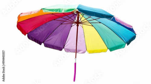 A vibrant beach umbrella with a rainbow of colors providing shade and a joyful atmosphere, symbolizing relaxation, summer fun, protection, vibrant energy, and carefree living.
