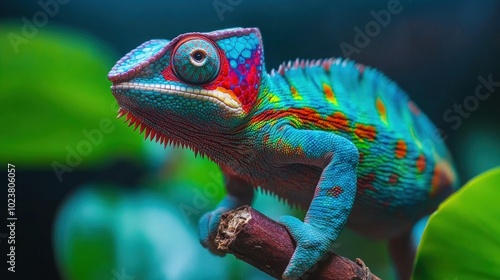 A vibrant blue chameleon with red and yellow markings perched on a branch, its eyes focused on something in the distance.