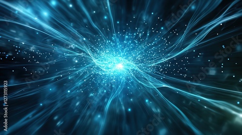A vibrant blue energy field with swirling digital particles, representing the flow of artificial intelligence