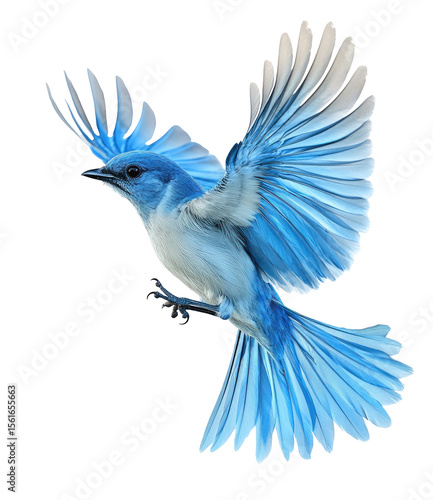 A vibrant blue jay in flight. Wings spread wide. Sharp focus