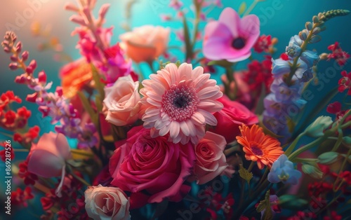 A vibrant bouquet of flowers in various colors, including pink, red, orange, and purple, on a blue background, perfect for celebrating International Womens Day