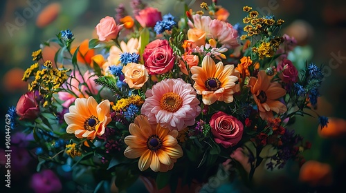 A vibrant bouquet of roses, gerbera daisies, and blue flowers dazzles in bright hues.