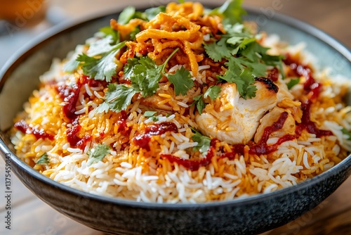 A vibrant bowl of biryani rice, featuring tender chicken, layered rice, and a fresh, colorful garnish of herbs and fried onions.